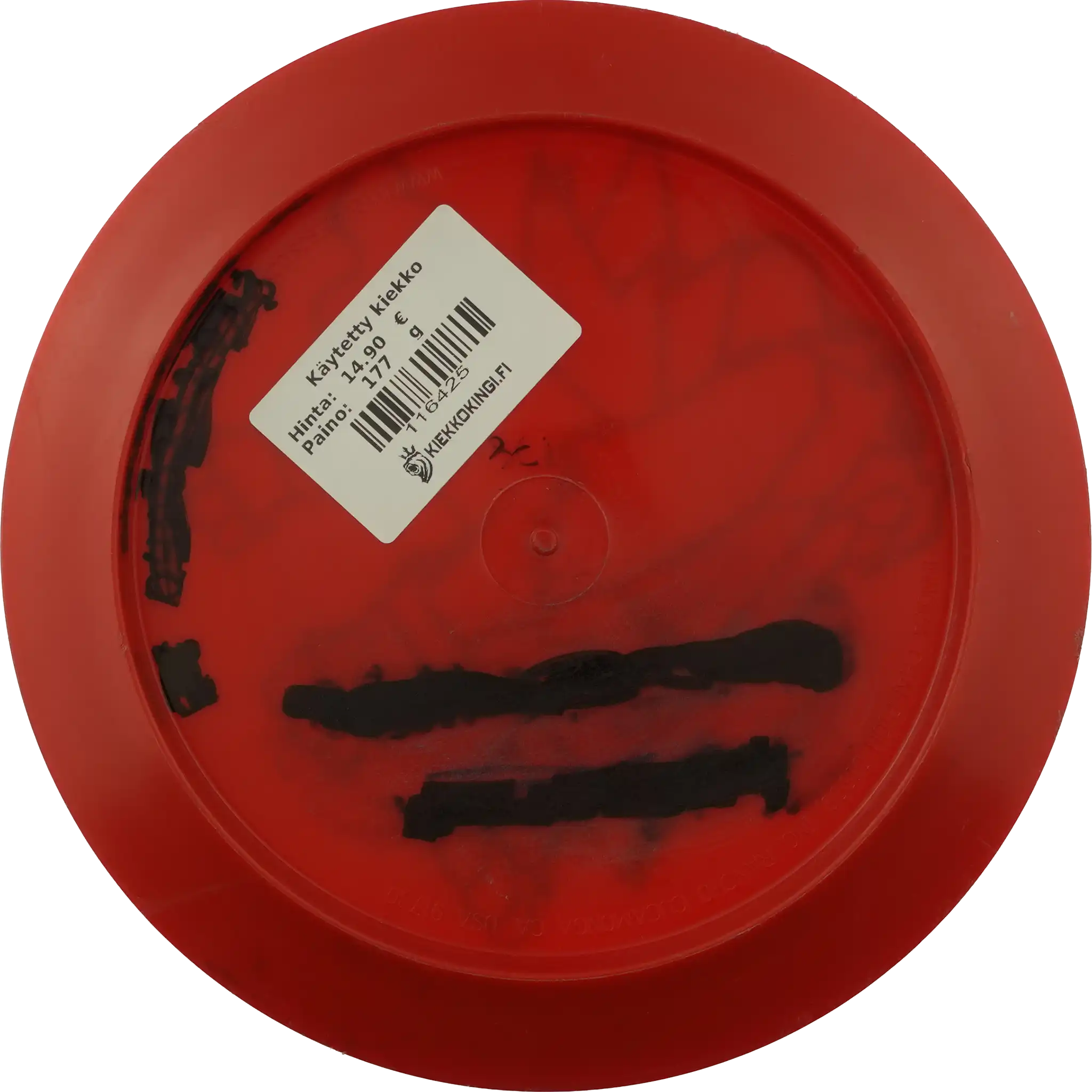 Käytetystä kiekosta löydät kuntoluokituksen lisäksi kolme tuotekuvaa (kansi, pohja ja siipi), painon (g) sekä tiedot tussimerkinnöistä.